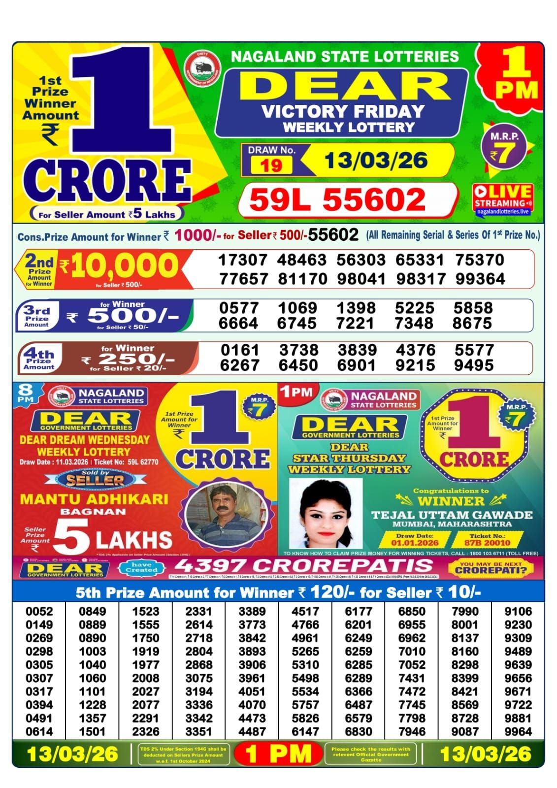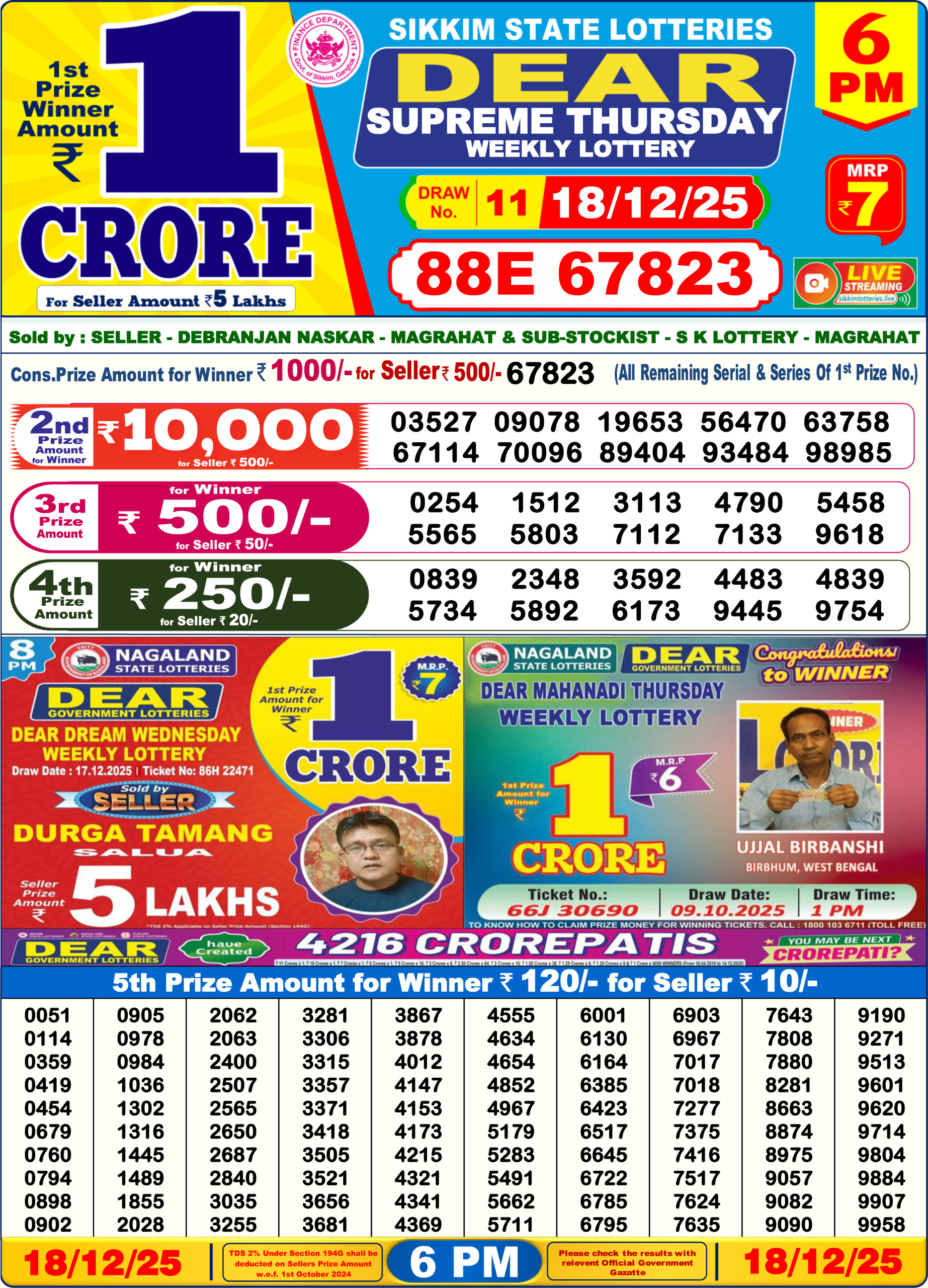Dear Lottery Result Today 1 PM 6 PM 8 PM