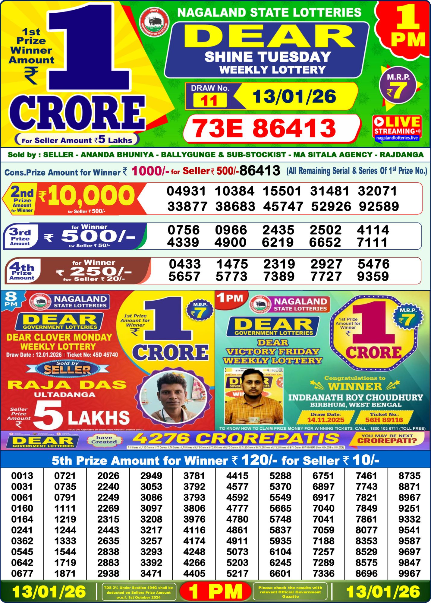 We have on 13/01/26 1st Result Today 1 PM Dear Shine Weekly Lottery Which will be Conducted on 1 PM 13/01/26.