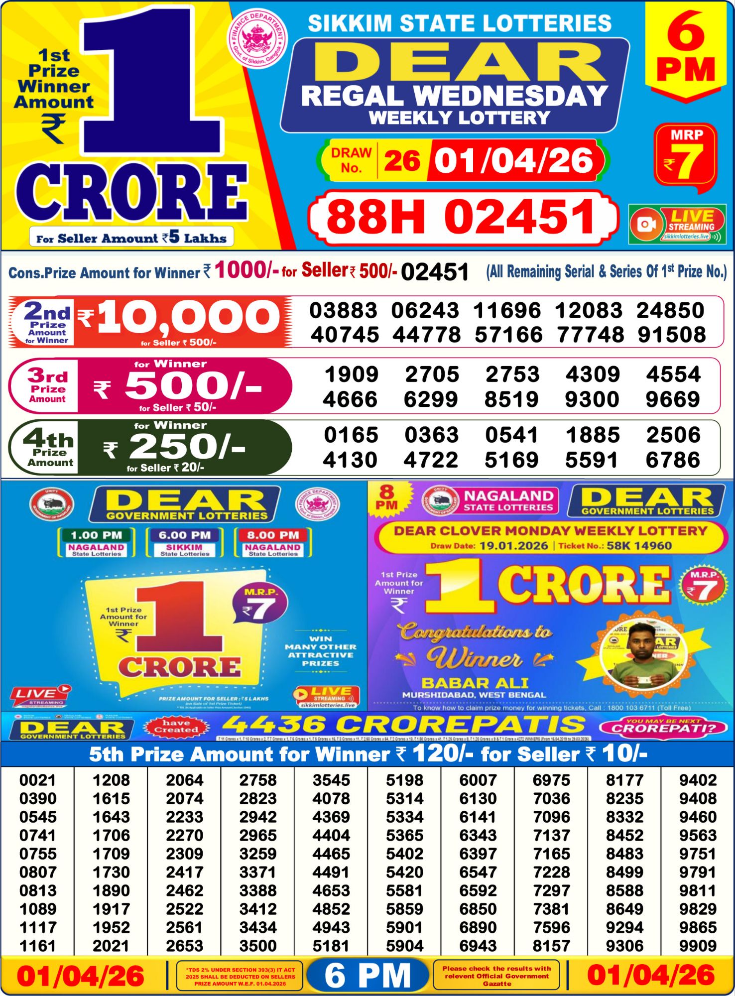 We have on 01/04/26 2nd Result Today 6 PM Dear Regal Weekly Lottery Which will be Conducted on 6 PM 01/04/26.