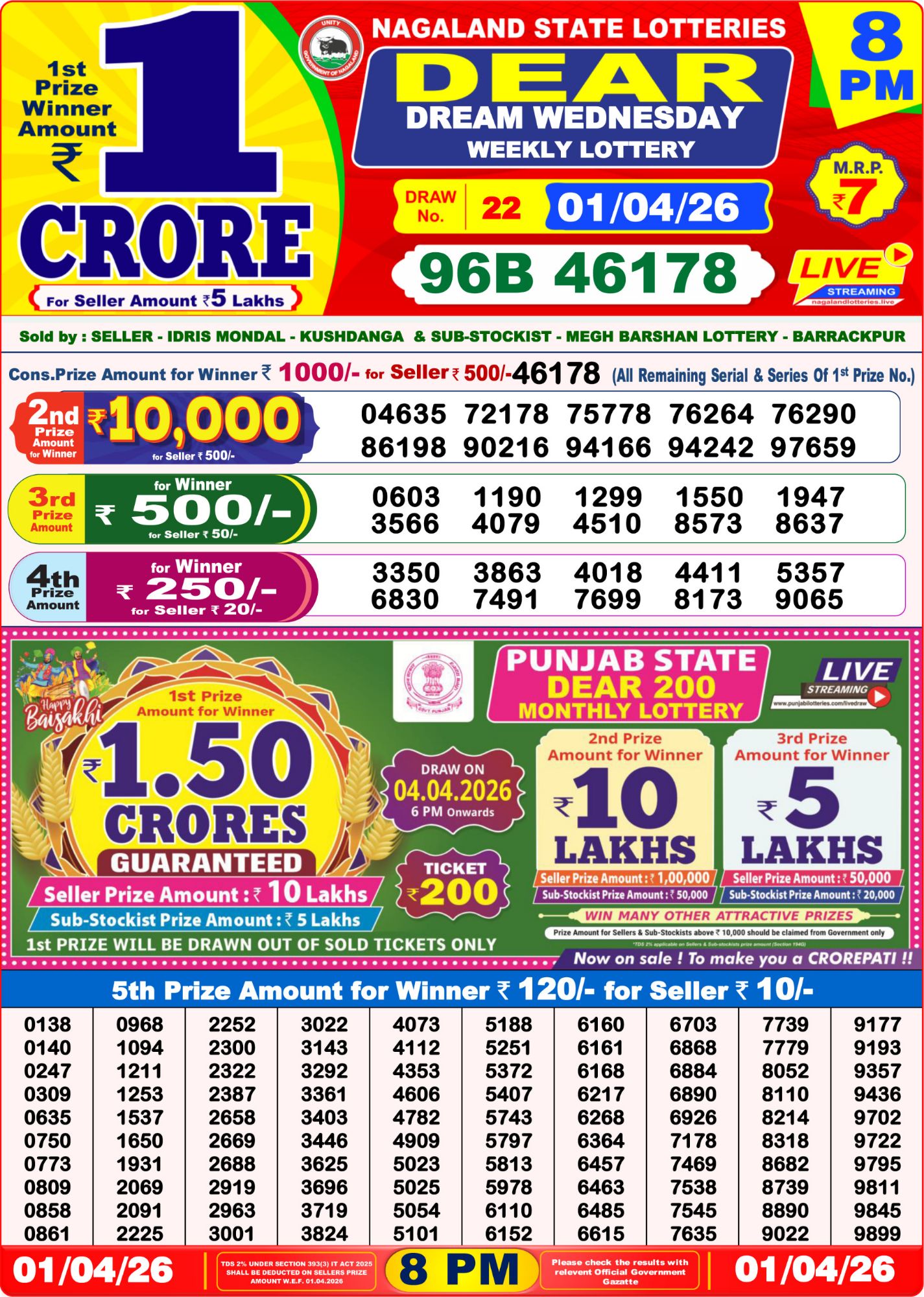 Attention players: the final draw of Dear Lottery Result Today 01/04/26 will be the 8 PM Lottery Sambad Result. This page will refresh with the official Dear Lottery result shortly after offiial declaration.