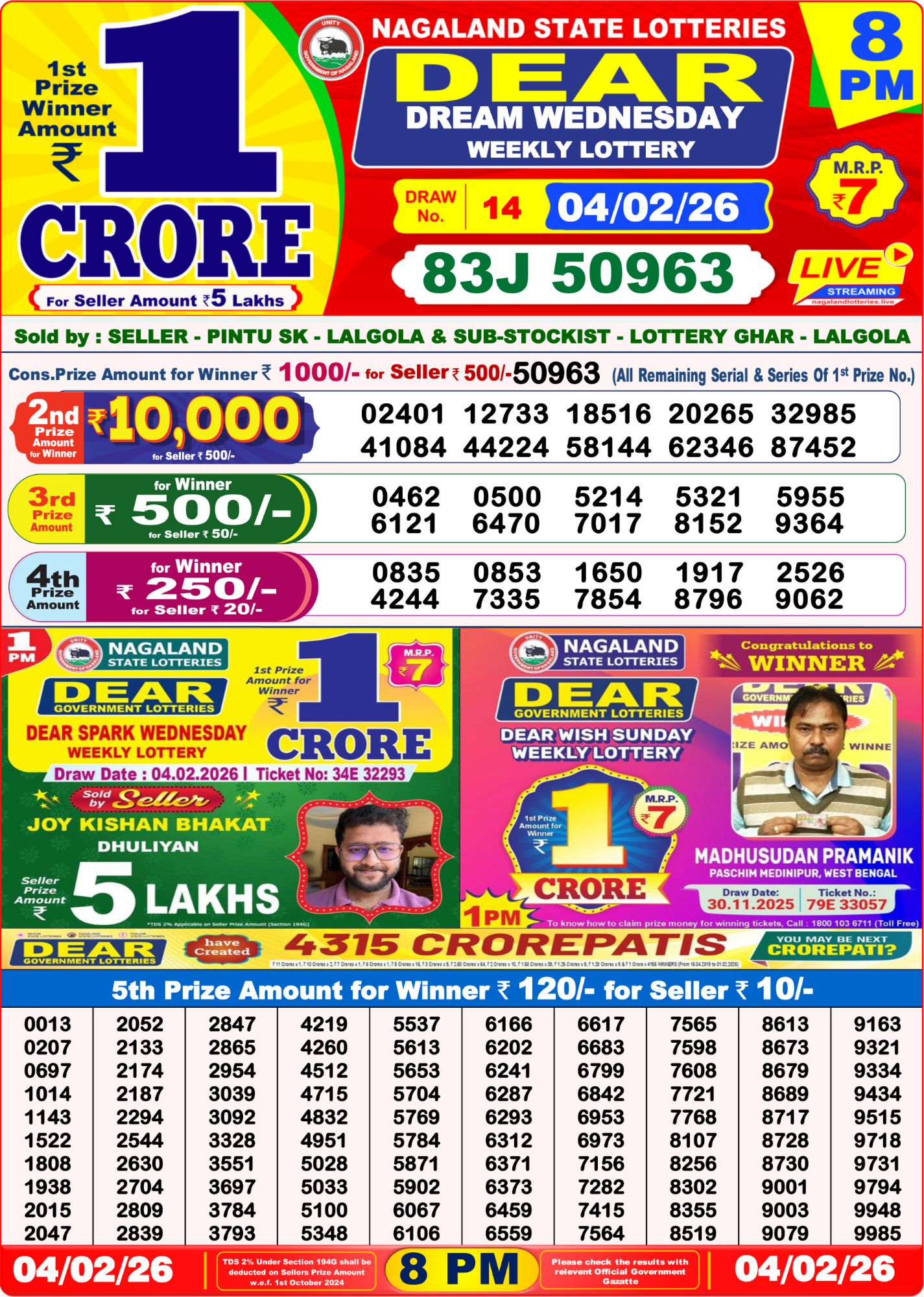 🎉 The Dear Lottery Result Today 8 PM (04/02/26) has been officially declared. This concludes all Lottery Sambad results for today. Check the winning number below and keep your ticket safe for prize winning claims.