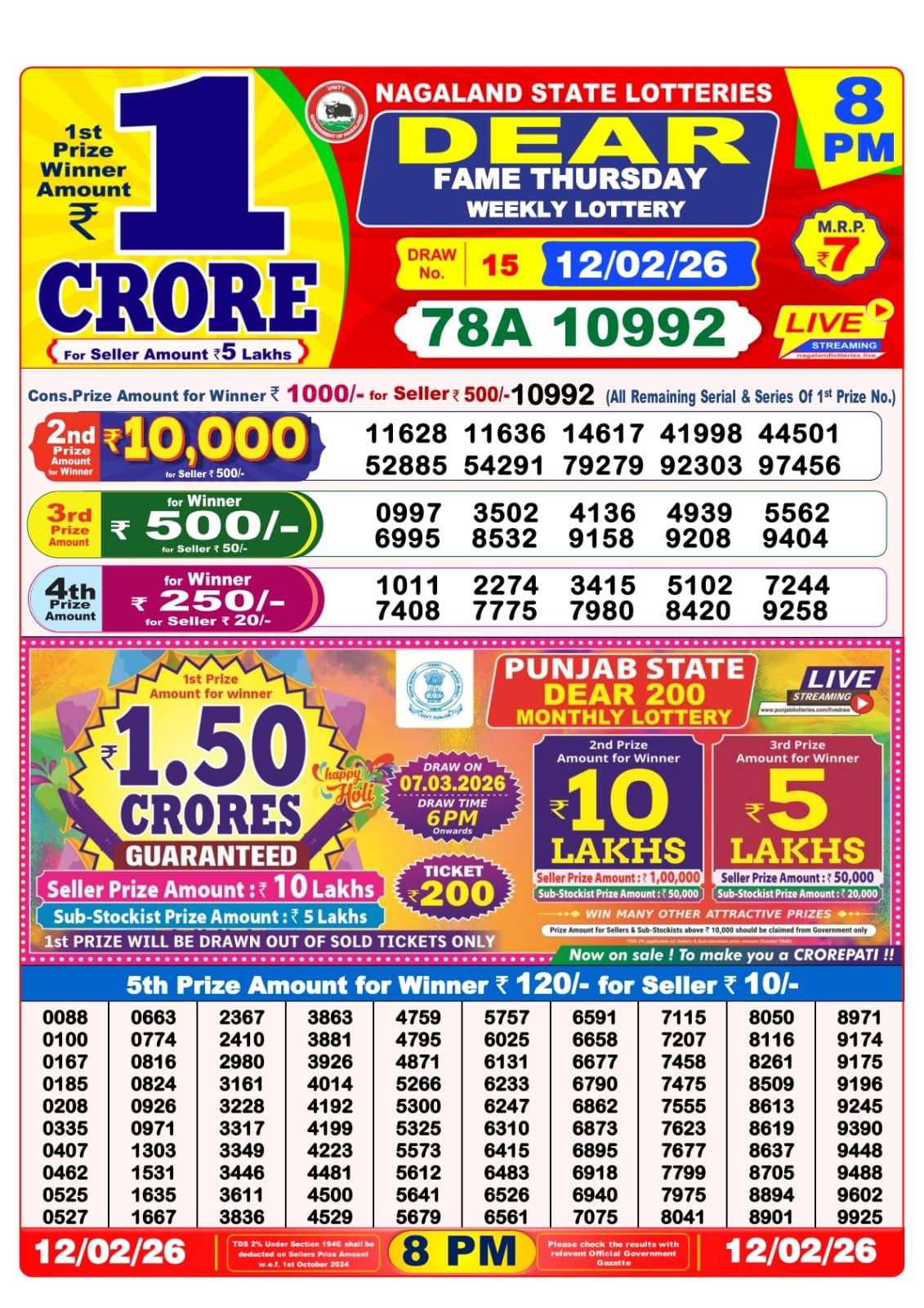 Attention players: the final draw of Dear Lottery Result Today 12/02/26 will be the 8 PM Lottery Sambad Result. This page will refresh with the official Dear Lottery result shortly after offiial declaration.