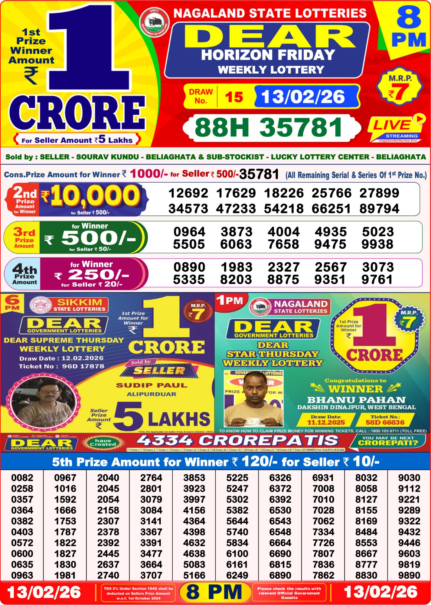 We have on 13/02/26 3rd Result Today 8 PM Dear Horizon Weekly Lottery Which will be Conducted on 8 PM 13/02/26.