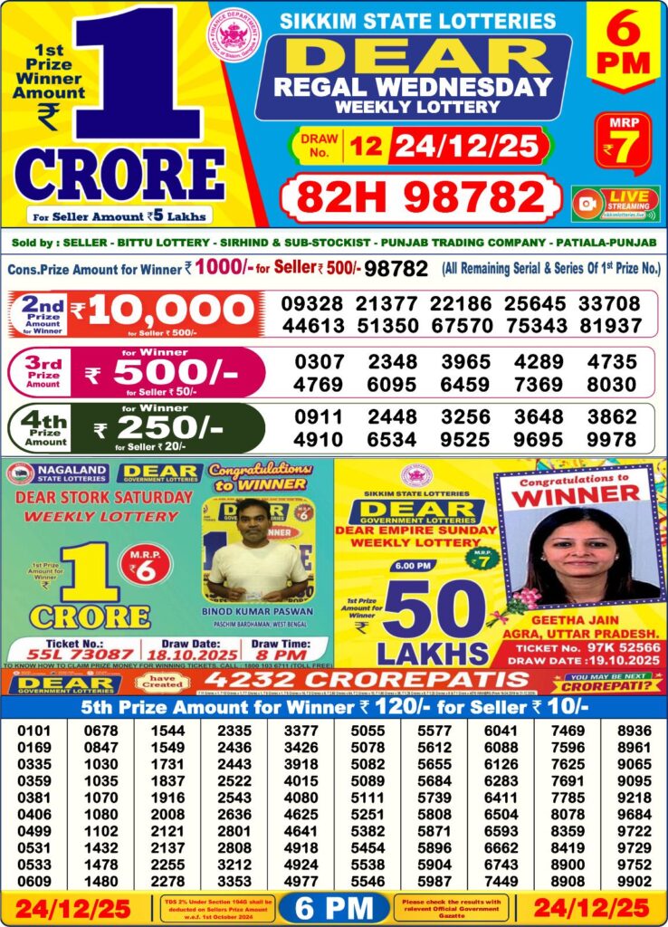 We have on 24/12/25 2nd Result Today 6 PM Dear Regal Weekly Lottery Which will be Conducted on 6 PM 24/12/25.