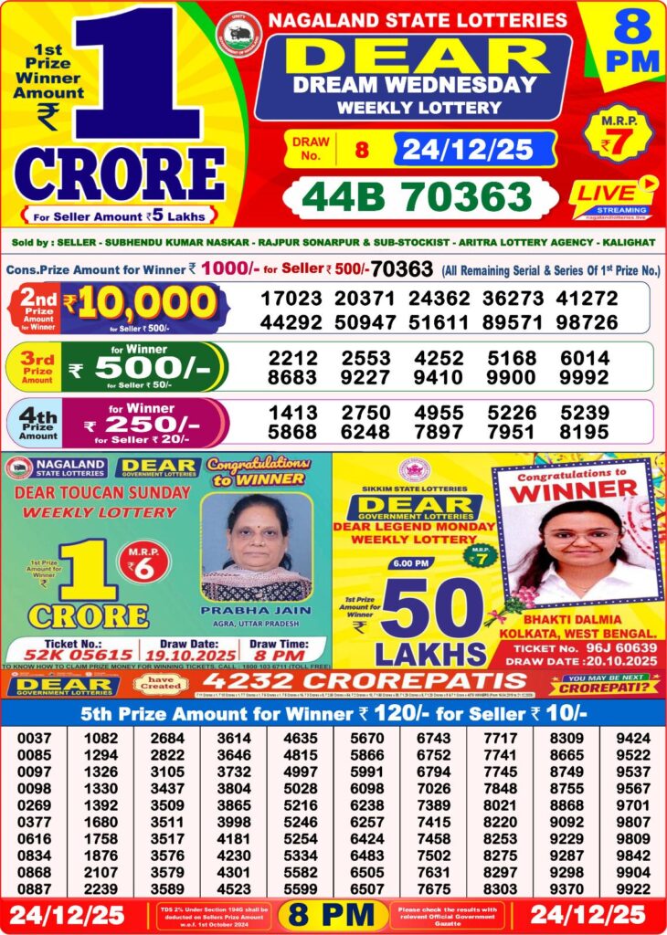 We have on 24/12/25 3rd Result Today 8 PM Dear Dream Weekly Lottery Which will be Conducted on 8 PM 24/12/25.