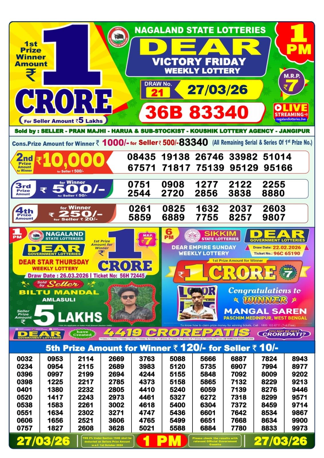 🎉 The Dear Lottery Result Today 8 PM (27/03/26) has been officially declared. This concludes all Lottery Sambad results for today. Check the winning number below and keep your ticket safe for prize winning claims.