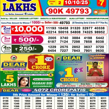 Dear Result 6PM 07-10-2025Official Evening Draw from Sikkim State Lotteries