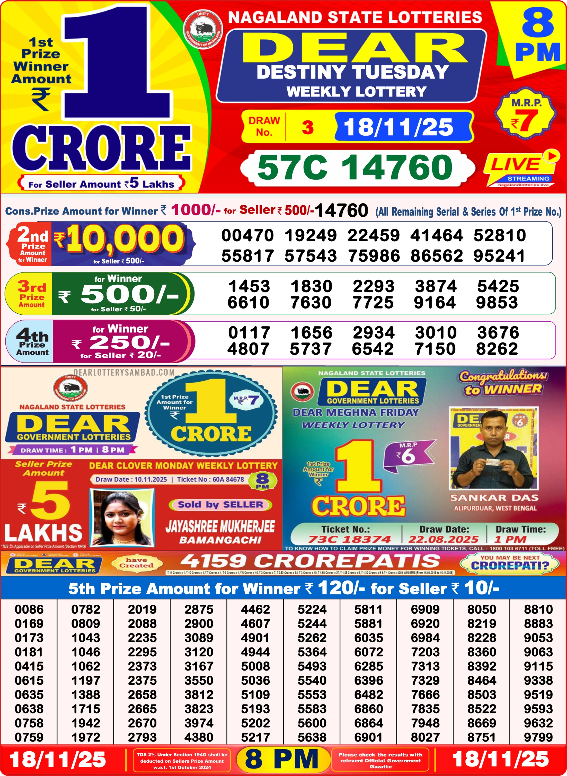 Lottery Sambad 8 PM Result Today 18/11/2025 Dear Night Live