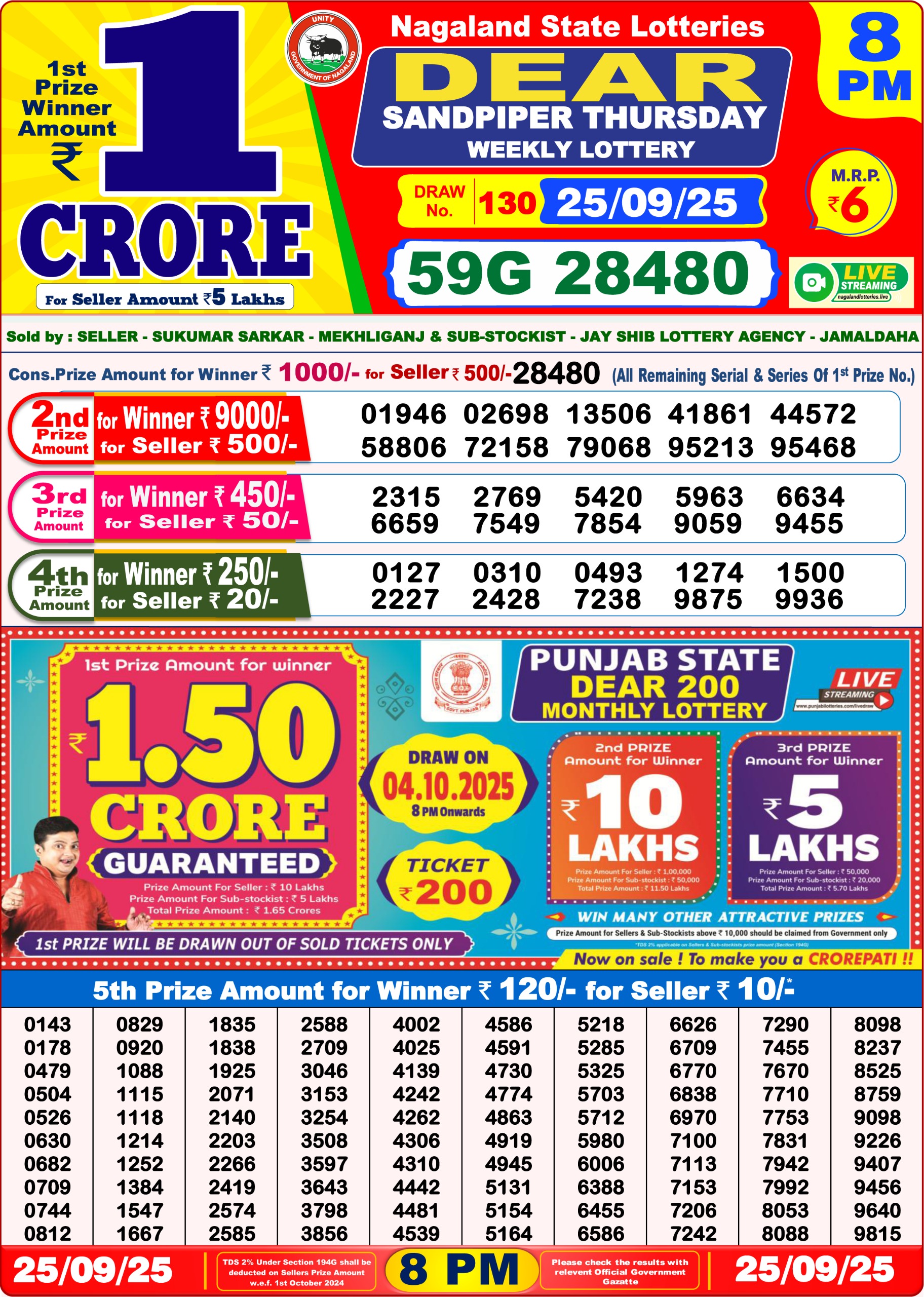 Dear Lottery 8 p.m. Result Nagaland State Live Draw 25/09/25