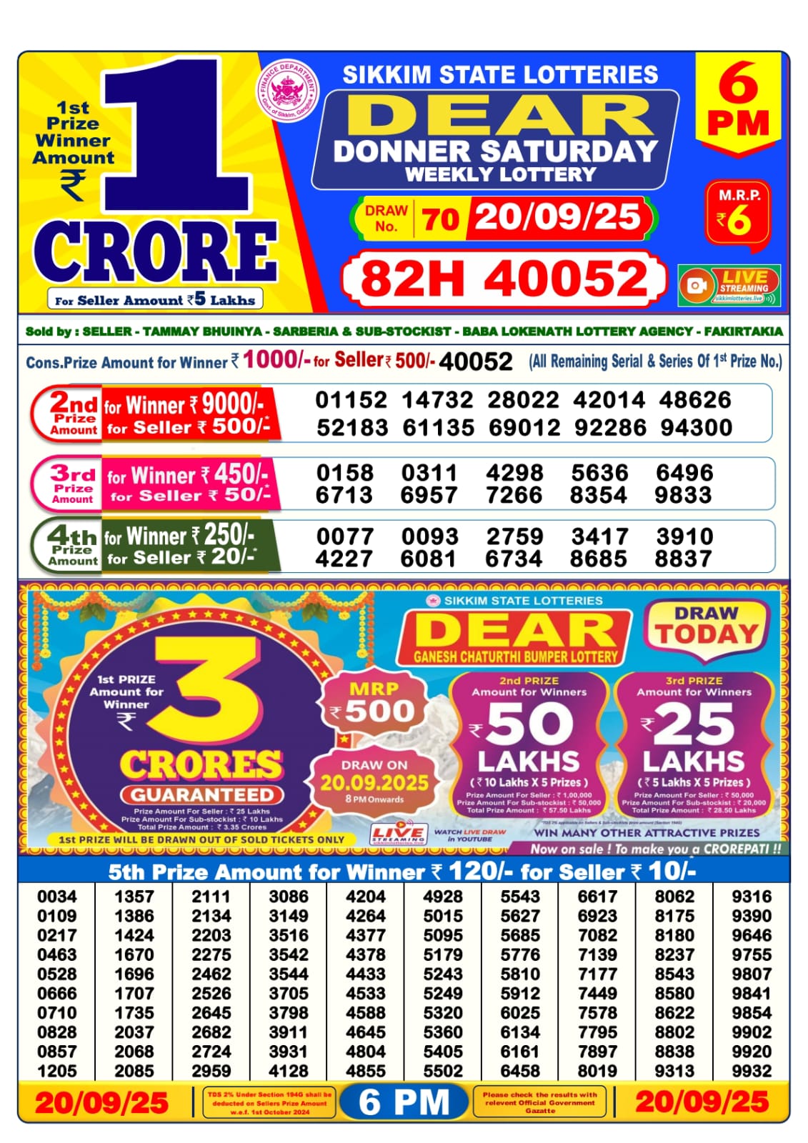 Sikkim State Lottery Sambad Result Today 6PM Dear Lottery Live 20/09/25
